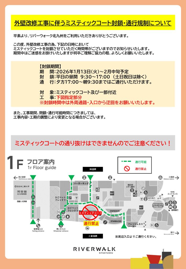 Event・Campaignイベント・キャンペーン ホーム イベント・キャンペーン イベント詳細 外壁改修工事に伴うミスティックコート封鎖・通行規制について その他 ※エスカレーター、エレベーターは通常通りご利用いただけます。 2025年12月23日 Tweet 一覧に戻る お店を探す ショップトピックス 特集 お店を探す ショップトピックス 特集 営業時間 物販店・サービス店 10:00~20:00 タベリバガーデン(フードコート) 11:00~20:30(O.S 20:00) タベリバ(レストラン) 11:00~21:00(O.S 20:00) アミューズメント 10:00~24:00 ※営業時間は一部店舗により異なります。 営業時間のお知らせ お問い合わせ Tel : 093-573-1500 リバーウォーク北九州情報サービスセンター 受付時間 10:00~20:00 ここから総合案内 総合案内 施設や設備のご案内 お子様連れのお客様へ お体の不自由なお客様へ ペットをお連れのお客様へ リバーウォークについて 求人情報 よくある質問 サイトについて プライバシーポリシー 運営会社について 出店をお考えの方 取材をご希望の方 各種映像装置ご利用のご案内 イベント・催事スペースのご案内