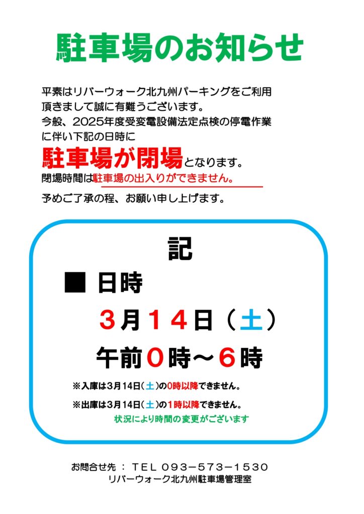 Event・Campaignイベント・キャンペーン ホーム イベント・キャンペーン イベント詳細 3/14(土) 駐車場閉場のお知らせ その他 2026年03月02日 Tweet 一覧に戻る お店を探す ショップトピックス 特集 お店を探す ショップトピックス 特集 営業時間 物販店・サービス店 10:00~20:00 タベリバガーデン(フードコート) 11:00~20:30(O.S 20:00) タベリバ(レストラン) 11:00~21:00(O.S 20:00) アミューズメント 10:00~24:00 ※営業時間は一部店舗により異なります。 営業時間のお知らせ お問い合わせ Tel : 093-573-1500 リバーウォーク北九州情報サービスセンター 受付時間 10:00~20:00 ここから総合案内 総合案内 施設や設備のご案内 お子様連れのお客様へ お体の不自由なお客様へ ペットをお連れのお客様へ リバーウォークについて 求人情報 よくある質問 サイトについて プライバシーポリシー 運営会社について 出店をお考えの方 取材をご希望の方 各種映像装置ご利用のご案内 イベント・催事スペースのご案内