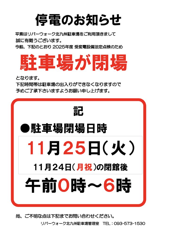 Event・Campaignイベント・キャンペーン ホーム イベント・キャンペーン イベント詳細 11/25(火) 駐車場閉場のお知らせ その他 2025年11月13日 Tweet 一覧に戻る お店を探す ショップトピックス 特集 お店を探す ショップトピックス 特集 営業時間 物販店・サービス店 10:00~20:00 タベリバガーデン(フードコート) 11:00~20:30(O.S 20:00) タベリバ(レストラン) 11:00~21:00(O.S 20:00) アミューズメント 10:00~24:00 ※営業時間は一部店舗により異なります。 営業時間のお知らせ お問い合わせ Tel : 093-573-1500 リバーウォーク北九州情報サービスセンター 受付時間 10:00~20:00 ここから総合案内 総合案内 施設や設備のご案内 お子様連れのお客様へ お体の不自由なお客様へ ペットをお連れのお客様へ リバーウォークについて 求人情報 よくある質問 サイトについて プライバシーポリシー 運営会社について 出店をお考えの方 取材をご希望の方 各種映像装置ご利用のご案内 イベント・催事スペースのご案内