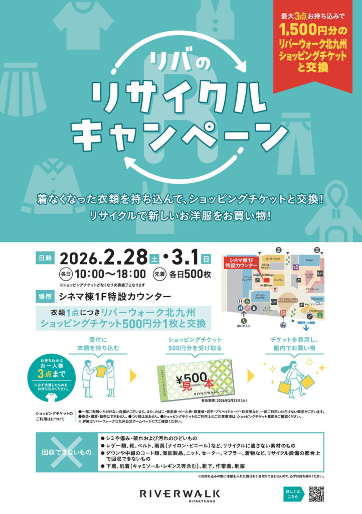 期間中、着なくなった衣類を持ち込んでいただくと、リバーウォーク北九州の対象店舗でご利用いただける、500円分のチケットを1枚進呈します。