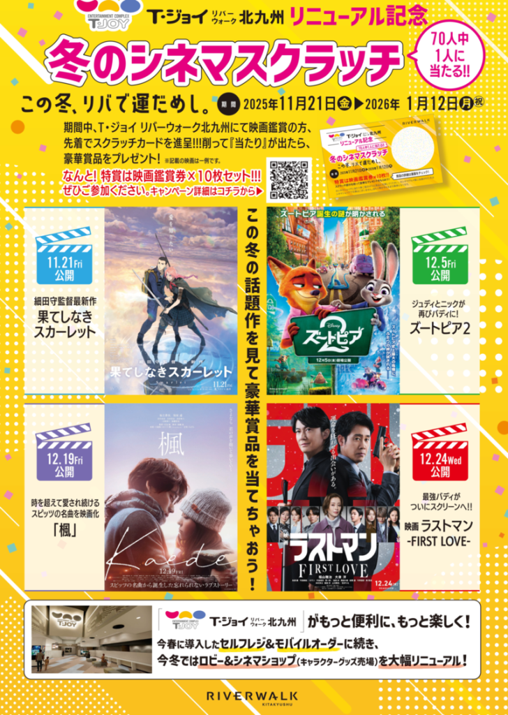 期間中、T・ジョイリバーウォーク北九州にて映画鑑賞の方に、先着でスクラッチカードを進呈!