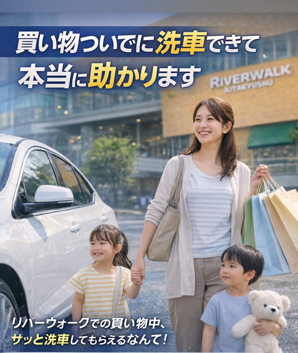 リバーウォーク北九州の駐車場に停めたまま、お買い物中に洗車が完了!